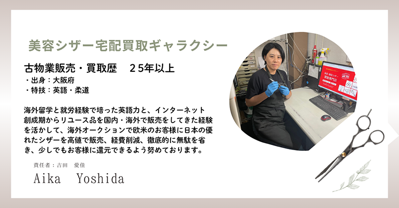古物販売業40年以上の実績![]() 創業1986年、大阪府寝屋川市に開業40年以上にわたり古物販売業に携わってきた当店は、美容理容シザーの価値を見極める確かな目を持っています。長年の経験と実績があるからこそ、安心してお任せいただけます。 |